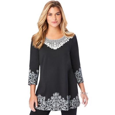 Roaman's Plus Size Lace Sleeve Printed Tee