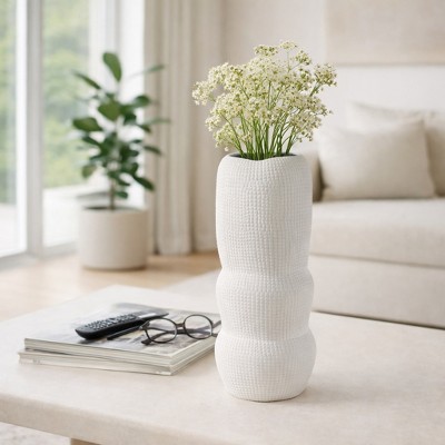 Coastal Textured Stoneware Ceramic Flower Vase for Table Display and Home Decor - Tall Vases Accent for Shelves and Centerpieces Style - Ivory, 11"