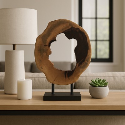 Decorative Round Wood Sculpture on Stand for Home Decor - Modern Abstract Statue for Living Room, Bathroom, and Office Decor - 19", Brown