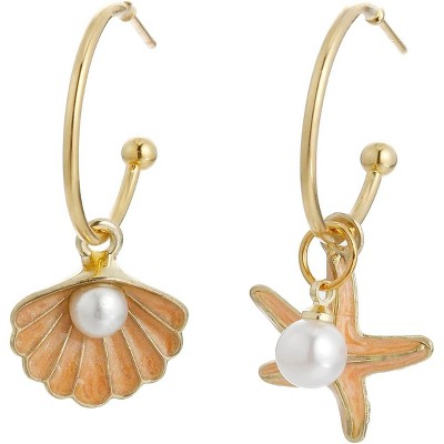 Asymmetric Shell and Starfish Hoop Earrings, Nautical Beach Jewelry.