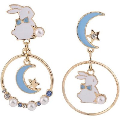 Asymmetric Rabbit Star Moon Earrings,Cute Bunny Pearl Crystal Drop Earring for Women Party Jewelry Gifts
