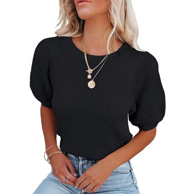 Womens Short Sleeve Lightweight Sweaters Crewneck Knit Pullover Tops with Crochet Sleeve Casual Crochet Blouse Shirt for Spring, Summer