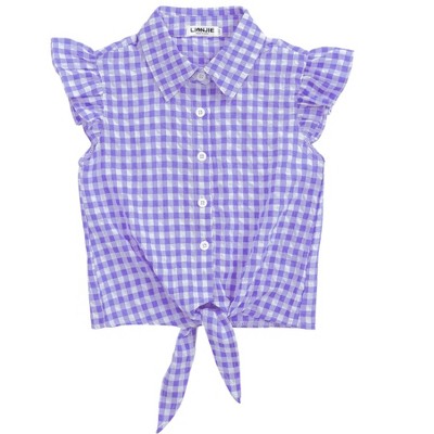 Clearlove Girls Sleeveless Plaid Button Down Shirt Summer Cropped Top with Tie Waist and Ruffled Hem Cute Casual Blouse Purple 150