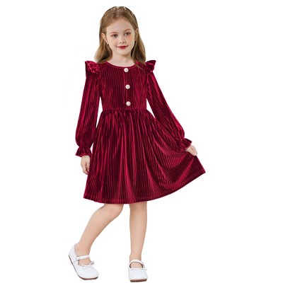 Arshiner Toddler Girls Long Sleeve Velvet Dress Ruffled Crew Neck Midi A-Line Fall Vintage Dress with Pockets for Kids 2-8Y