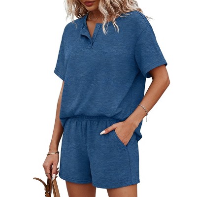 Women's Two Piece Loungewear Set Short Sleeve Henley Top and Elastic Waist Shorts with Pockets for Casual Wear
