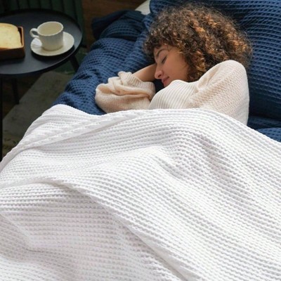 Queen Size Snag Proof Throw Blanket White Cotton Waffle Weave Breathable Machine Washable for Cold Weather Layering