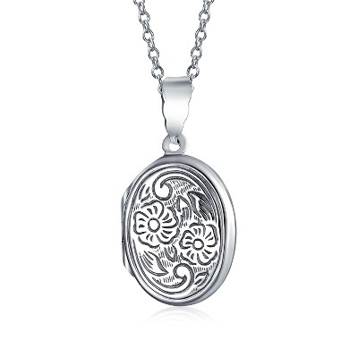 Bling Jewelry Embossed Scroll Floral Flower Sunflower Keepsake Photo Oval Lockets Necklace Pendant oxidized Sterling Silver Med