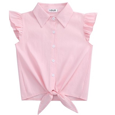 Girls Sleeveless Plaid Button Down Shirt Summer Crop Tops Tie Knot Ruffle Sleeve Shirt Blouse 3-12Y