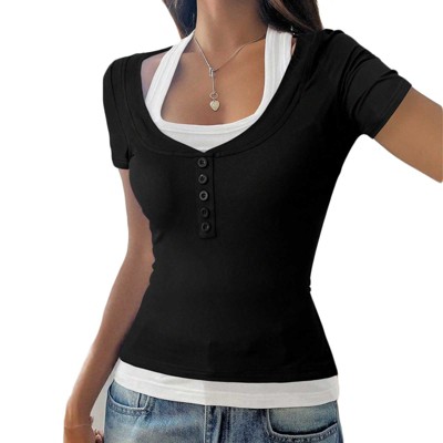 Women's Henley Neck Short Sleeve T-Shirt, Casual Slim Fit Layered Top for Daily Wear