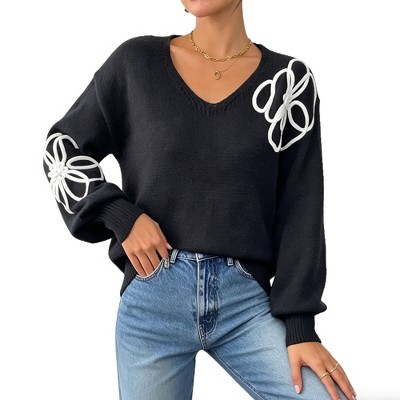 Women's Ribbed Knit Pullover Deep V Neckline Sweater Floral Embroidery Balloon Sleeves Cuffs Relaxed Fit Cozy Winter Top