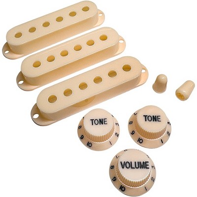 AxLabs Set Of Single Coil Pickup Covers In Modern Spacing (52/50/48), Two Switch Tips, And Three Knobs (Black Lettering)