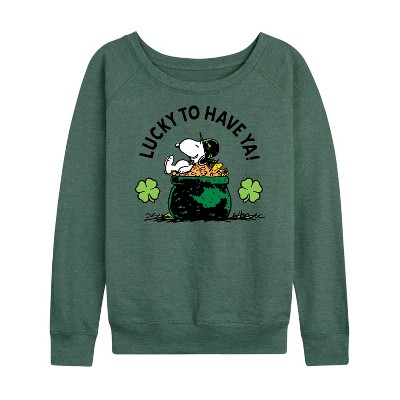 Women's - Peanuts - Lucky To Have Ya Lightweight French Terry Wide Neck Long Sleeve Graphic Shirt