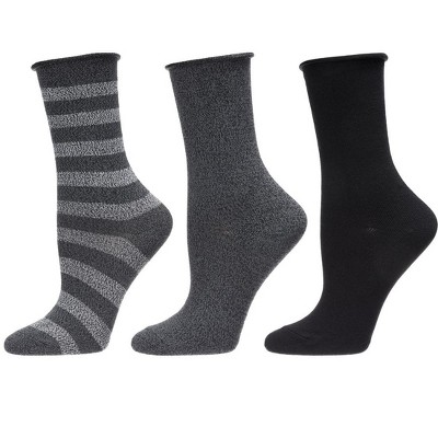 MeMoi Women's 3 Pair Pack Checkmate Triple Cuff Crew Socks Black-Nude 9-11