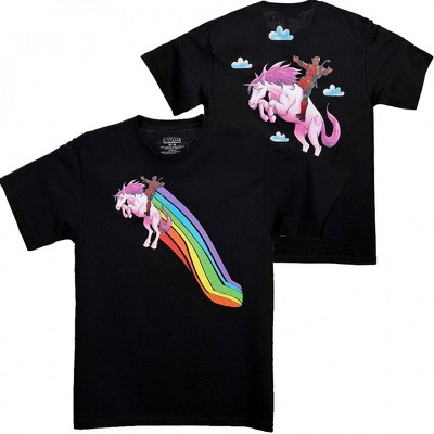 Mens Deadpool Flying High on a Unicorn Front and Back T-Shirt