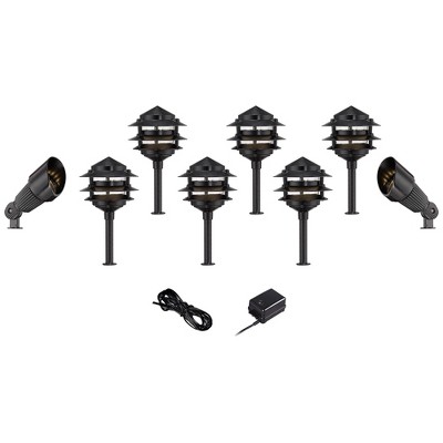 John Timberland Pagoda 12" High Modern 9-Piece Complete Outdoor Landscape Lighting Set Porch House Exterior LED Bulb Dusk To Dawn Black Aluminum