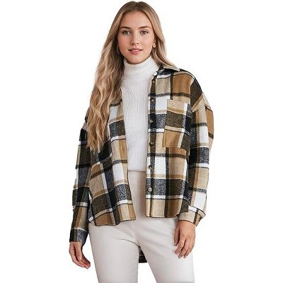 Coolmee Women's Button Down Flannel Shirts Plaid Shacket Long Sleeve Collared Business Casual Tops Work Blouses