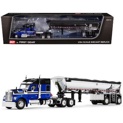 Kenworth W990 76" Mid-Roof Sleeper and MAC Half Round End Dump Trailer Blue and Black 1/64 Diecast Model by DCP/First Gear