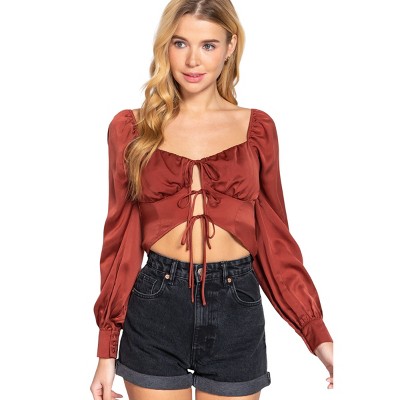 INSPIRE CHIC Women's Flounce Long Sleeve Ruched Tie Back Lightweight Crop Top