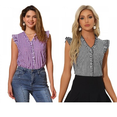 INSPIRE CHIC Women's Cap Sleeve Plaid Gingham Ruffle Shirt 2 Packs