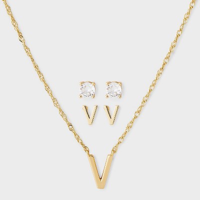Brass Polished Letter Charm Necklace & Cubic Zirconia Stud Earrings 3pc Set - A New Day™ Gold
