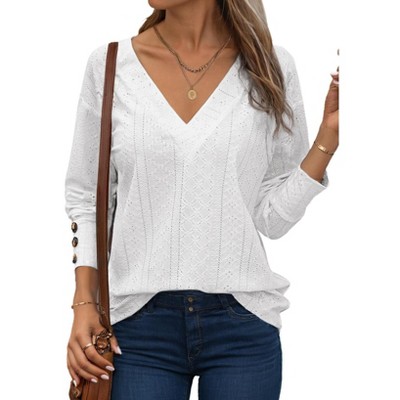 Womens Tops Dressy V Neck Long Sleeve Shirts Buttons Business Casual Hollow Out Embroidered Tops