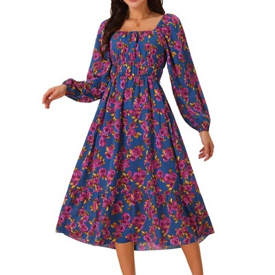 Seta T Women's Boho Square Neck Long Sleeve Floral Flowy Midi Casual Vacation Dress