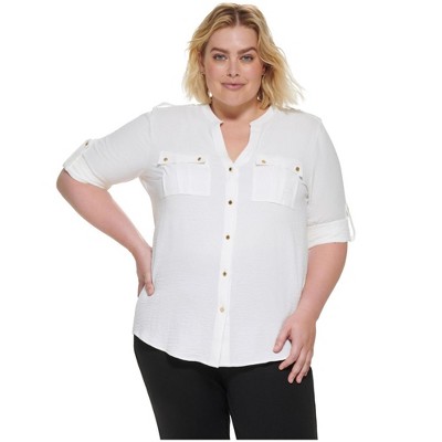 Calvin Klein Womens Textured Roll Tab Button Up Shirt