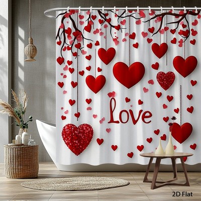 Lomsoe 1pc Valentine'S Day Shower Curtain,Red Heart Love Pattern with Background & Branches,Machine Washable with Hooks Included.