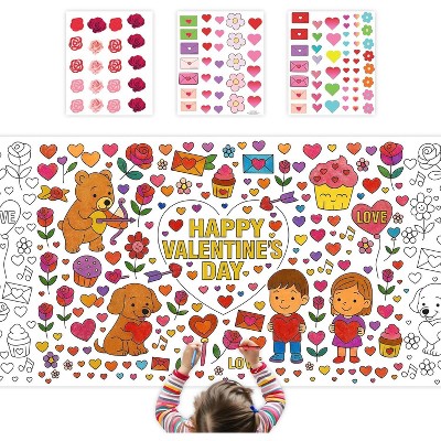 4E’s Novelty 103-Pack Valentine Stickers with 30 x 72 Inch Giant Coloring Poster for Kids, Classroom Crafts & Party Activities