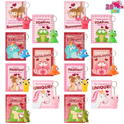 Joyfy 28 Pack Valentine Day Classroom Exchange Gift Cards with Fidget Popping Animal Keychains Gift Card and Toy Set Animal Keychain Assorted Colors