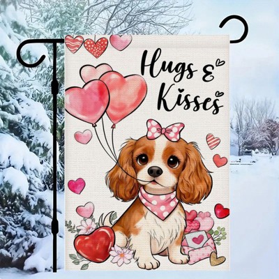 Valentine's Day Single-Sided Burlap Garden Flag Hugs & Kisses Dog with Hearts & Balloons Outdoor Decor 12x18in