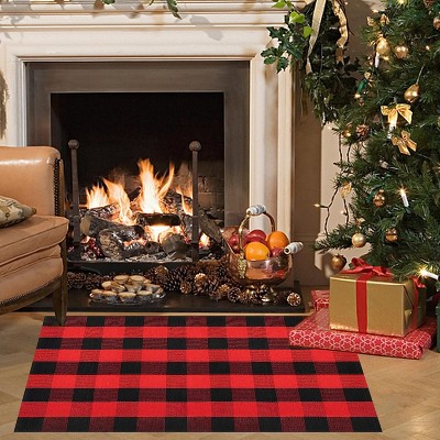 Lomsoe 1pc Christmas Buffalo Plaid Area Rug, Red Black Tartan Non-Slip Front Door Mat for Living Room Bedroom Kitchen Entryway.