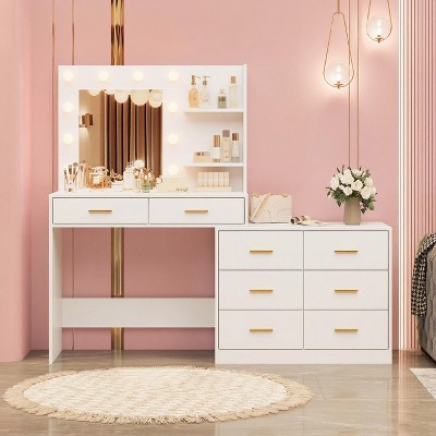 Lancenix Vanity Table with Lights for Teen Girls Purple Makeup Desk with Mirror and Chair Vanity Set