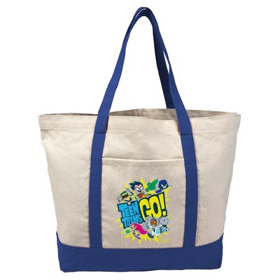 Teen Titans Go Logo and Characters Burst Canvas Tote Bag With External Pocket, Reusable Shoulder Bag for Shopping, School, Beach, Royal