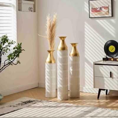 Angel Sar 3-Piece Gold Line Vase Set, Tall White Ceramic Vases with Vertical Stripe Pattern, 33.5" 28.7" 24" H Home Decor