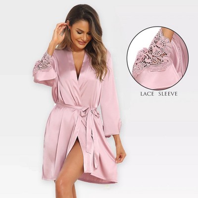 Coolmee Women's Satin Robe Valentines Lingerie Duster Bathrobe Short Ruffle Belted Robes Sleepwear