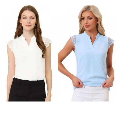 INSPIRE CHIC Women's Work Office V Neck Stand Collar Lace Cap Sleeve Basic Blouse 2 Pieces