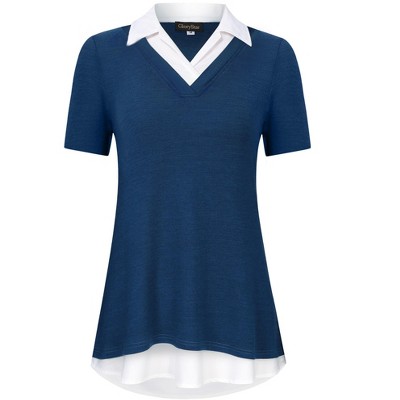 Women's Short Sleeve V-Neck Contrast Collared Shirts Patchwork Work Blouse Tunics Tops