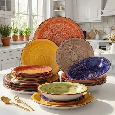 18 Piece Dinnerware Sets, Enameled Stoneware Plates and Bowls Sets Service for 6, Microwave Dishwasher Safe, Chip Resistant Colorful Kitchen Dishes