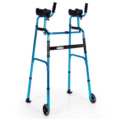 Gymax Premium All-Terrain Rolling Walker Stand-Assist Walker with Adjustable Armrests Easy-Fold Design and Stability Enhancements Blue/Silver