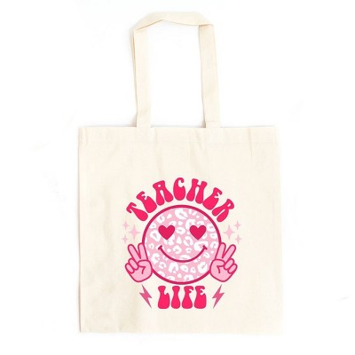 City Creek Prints Teacher Life Leopard Smiley Face Canvas Tote Bag - 15x16 - Natural