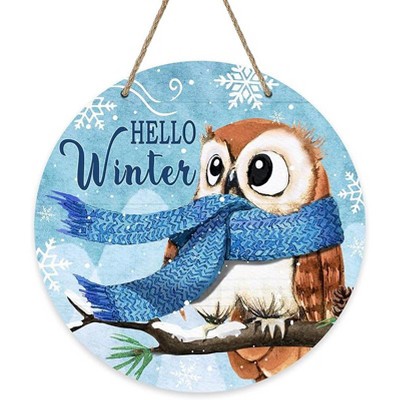 Lomsoe Hello Winter Owl Bird Blue Sign Pine Snowflakes Wood Door Hanger Holiday Seasonal Wooden Wreath Indoor Wall Hanging Decor Winter Gift 8x8 Inch