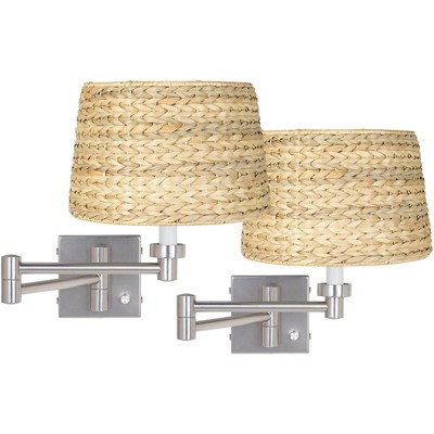 Barnes and Ivy Eleganta Vintage Swing Arm Wall Lamps Set of 2 Brushed Satin Brass Plug-In Light Fixture White Linen for Bedroom