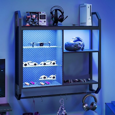Bestier 33" Floating Shelves with Adjustable Glass Shelves LED Lights Wood Wall Mounted Storage Display Shelves for Kitchen Bathroom