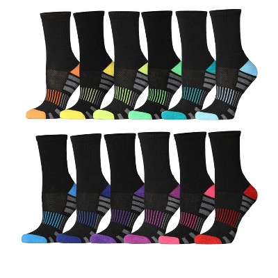Tipi Toe Women's 12 Pairs Black /Color Toe Patterned Cushioned Comfort Athletic Running, Active Comfort Crew Socks