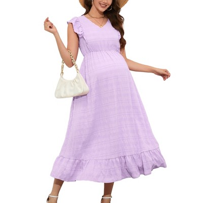 Maternity Swiss Dot Flowy Midi Dress Summer Short Sleeve V Neck Casual Dress with Belt Baby Shower
