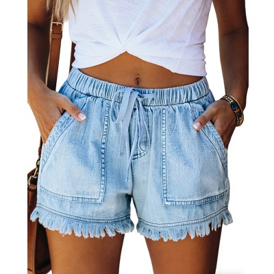 Women's Elastic Waist Drawstring Frayed Hem Denim Shorts with Pockets Casual Summer Bottoms
