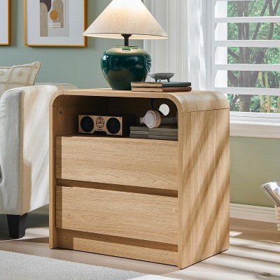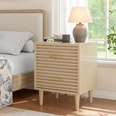Night Stand Set 2, Nightstands w/Charging Station & LED Light, Fluted Bedside Table with Drawer Storage, End Table for Bedroom Living Room Sofa, Oak