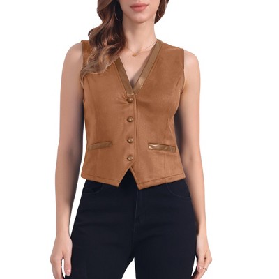 INSPIRE CHIC Women's V Neck Faux Suede Button Down Side Pockets Sleeveless Vest