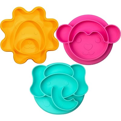 Bentology Silicone Compartment Plates- 3 Pk Animal Set (Lion Monkey Elephant) Divided Sections, Non-Slip Unbreakable, Flexible Shapes- Toddlers, Kids